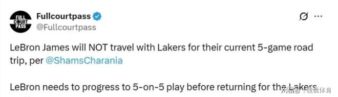 北京時(shí)間11月6日,ESPN名記Shams曝光了湖人超巨勒布朗·詹姆斯的最新復出進(jìn)展。受坐骨神經(jīng)痛影響,詹姆斯新賽季至今尚未出戰任何一場(chǎng)比賽,也未參與球隊合練,始終留在洛杉磯進(jìn)行康復與單獨訓練。