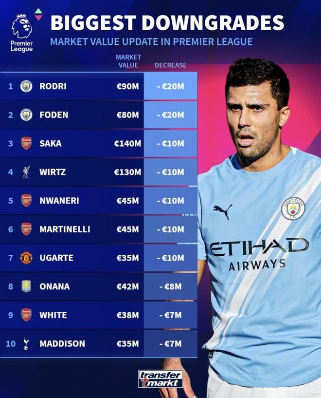 本輪整體是“去泡沫+傷病折價(jià)”為主旋律;但對本土核心、能打多位置的球員(福登、懷特)的稀缺溢價(jià)體現不足,而對處高位的技術(shù)核心(維爾茨)與潛力股(恩瓦內里)的下調略重??傮w合理,但個(gè)別檔位應更精細分層。